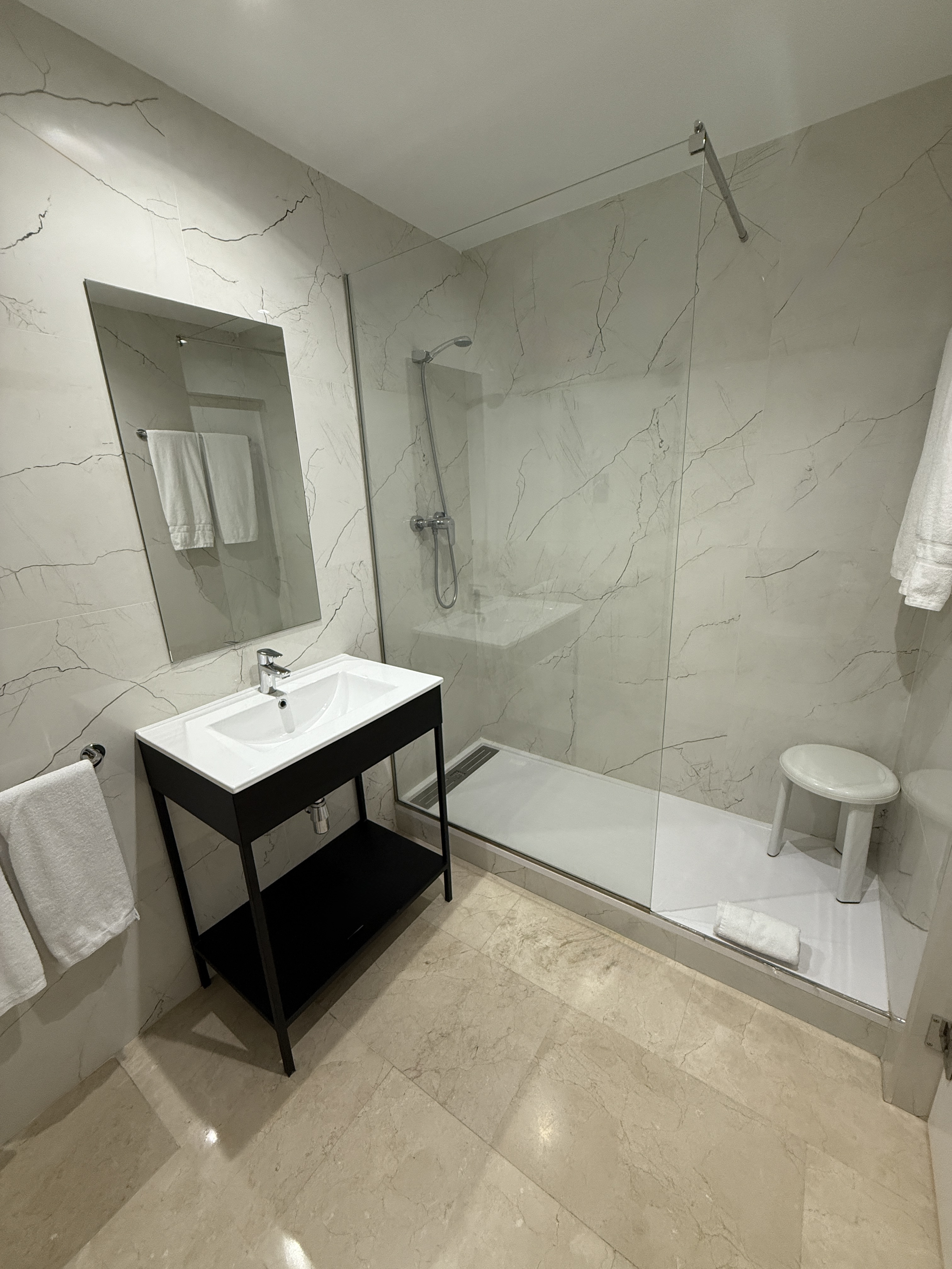 Spacious room with large beds, decorated with class and distinction with private heating and air conditioning, flat screen TV, soundproof windows with blackout curtains. They have direct dial telephone, free Wifi or cable internet access, desk and marble floors. The bathrooms are private and have a hairdryer, bidet, shower, washbasin and other accessories typical of an elegant hotel near Madrid.